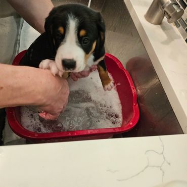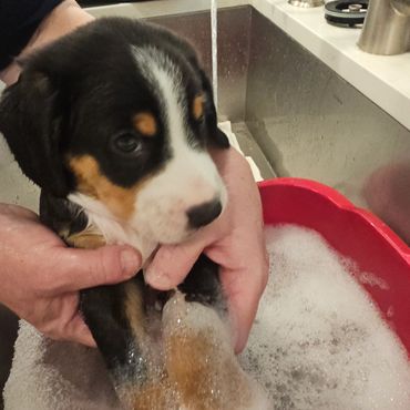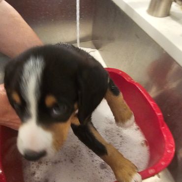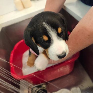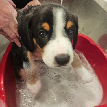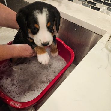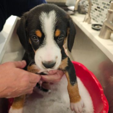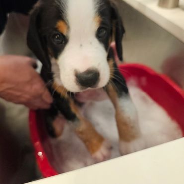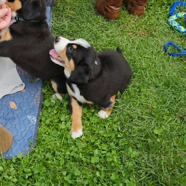 CH Entles Edge Echo is the Dam. Echo is sweet, attentive, loving, intelligent, loyal, and confident. Echo has many accolades in the show ring; however, when she is not somewhere performing, she loves going on adventures in the car with her family pack or simply cuddling on the couch. Echo has completed all breed-specific health testing with great results, and also has a low coefficient of Inbreeding (COI). Echo is a wonderful representative of the Entlebucher Mountain Dog breed.